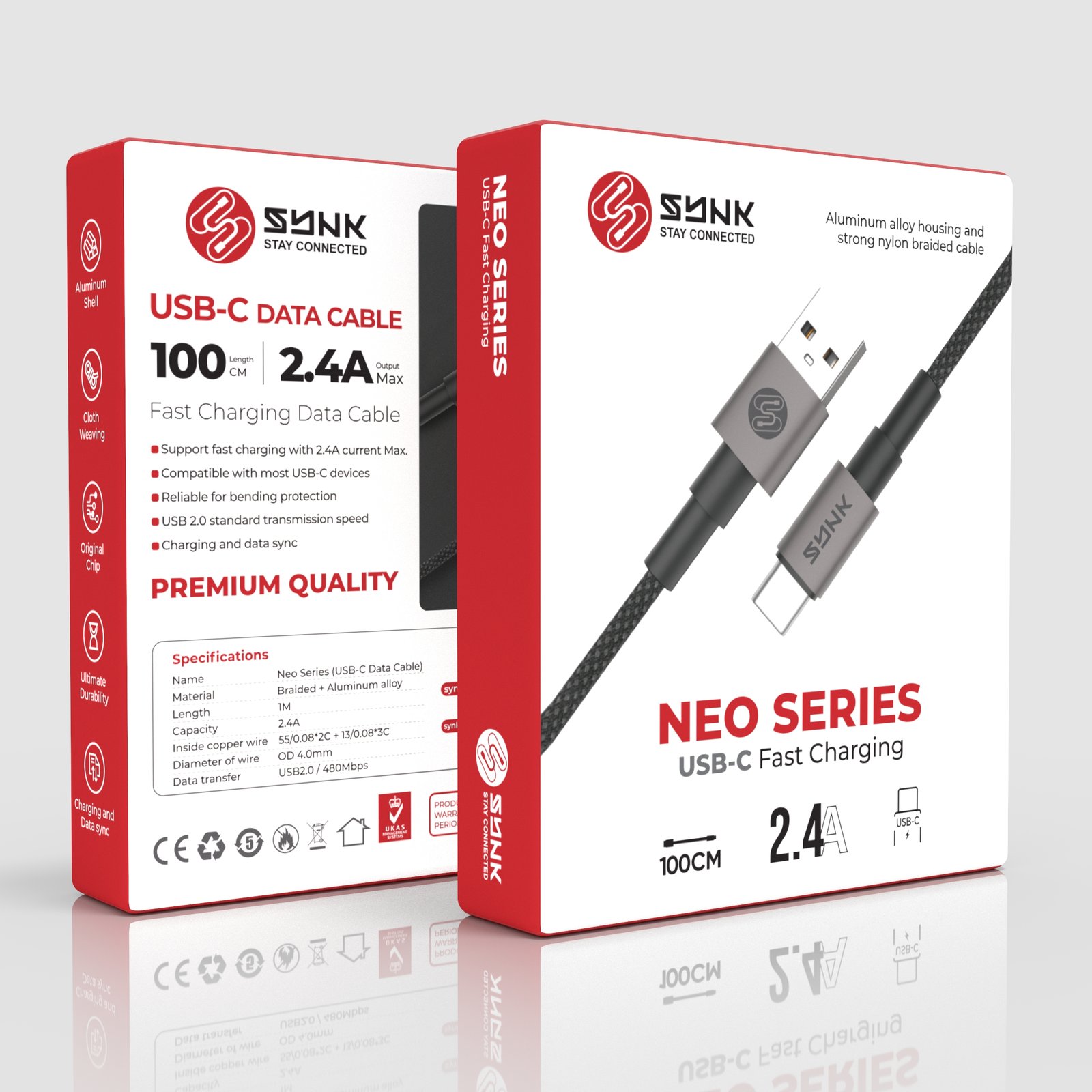 | Fast Charging 2.4A • USB-A to USB-C • Aluminum Alloy Connectors • Nylon Braided Cable • Original Smart Chip • Charging & Data Sync • High Durability |